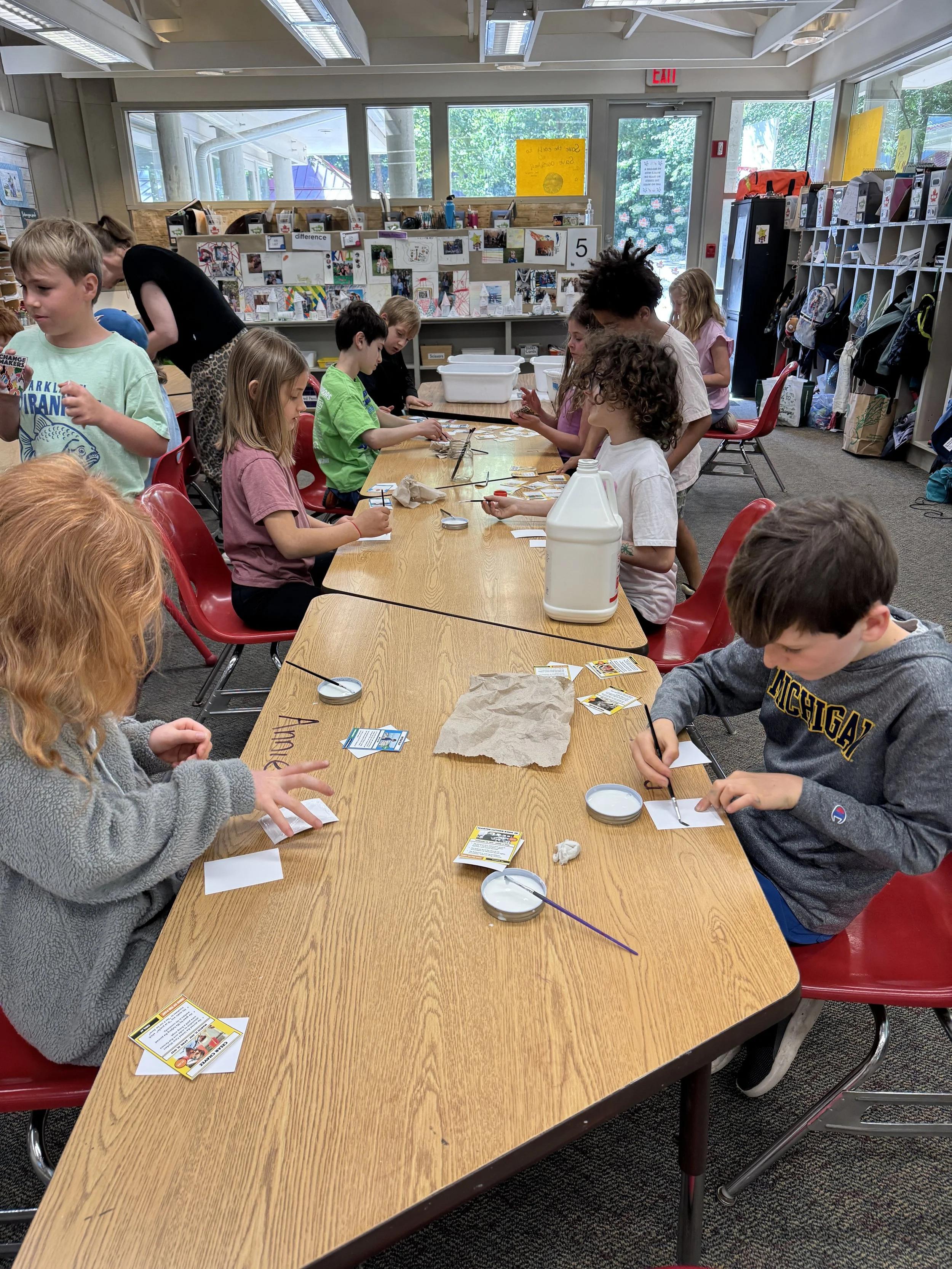 Inspired by their love of Pokémon, students researched historical figures and created their own “Changemaker Trading Cards.” They read biographies, distilled key information, and even managed production, marketing, and sales. Our classroom transformed into a messy assembly line of cutting, gluing, and orchestrated chaos. Proceeds went to the Green Belt Movement, allowing kids to see that their creativity could ripple outward into real-world impact.